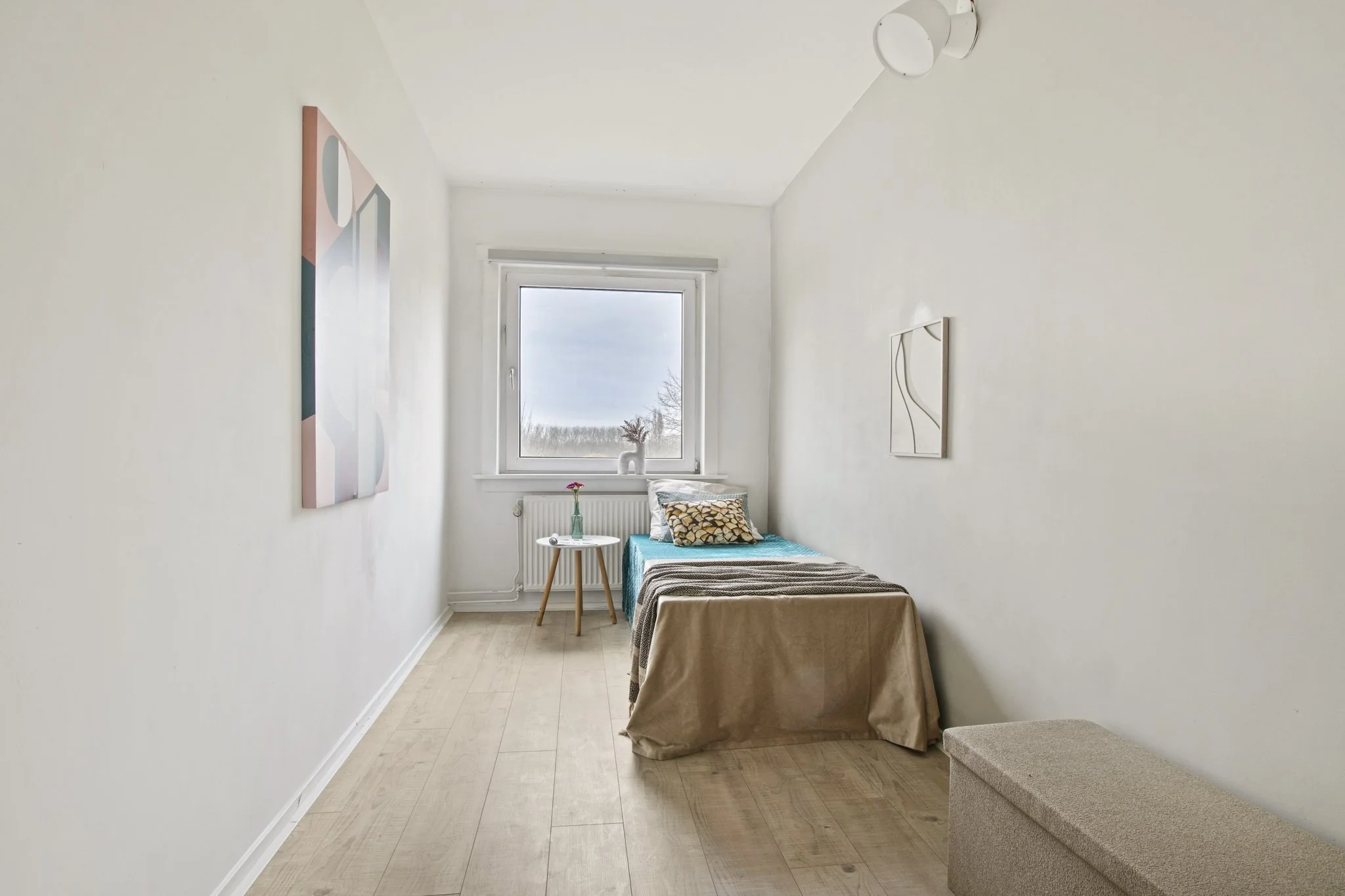 The living room is spacious and wonderfully bright thanks to the large windows spanning the entire width of the apartment. From here, there is access to the west-facing balcony. The living room is open plan to the kitchen, which is equipped with built-in appliances and ample work and storage space.