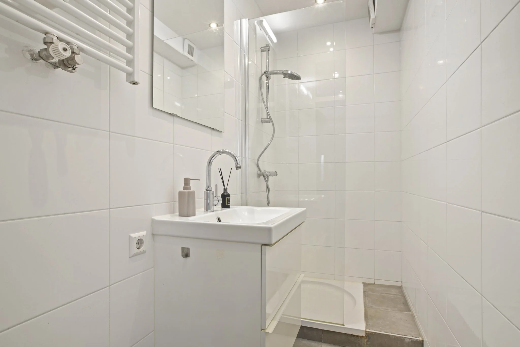 Centraal in de woning vind je de badkamer, uitgerust met een douche, wastafel en wasmachineaansluiting. Het separaat toilet bevindt zich in een aparte ruimte naast de badkamer.