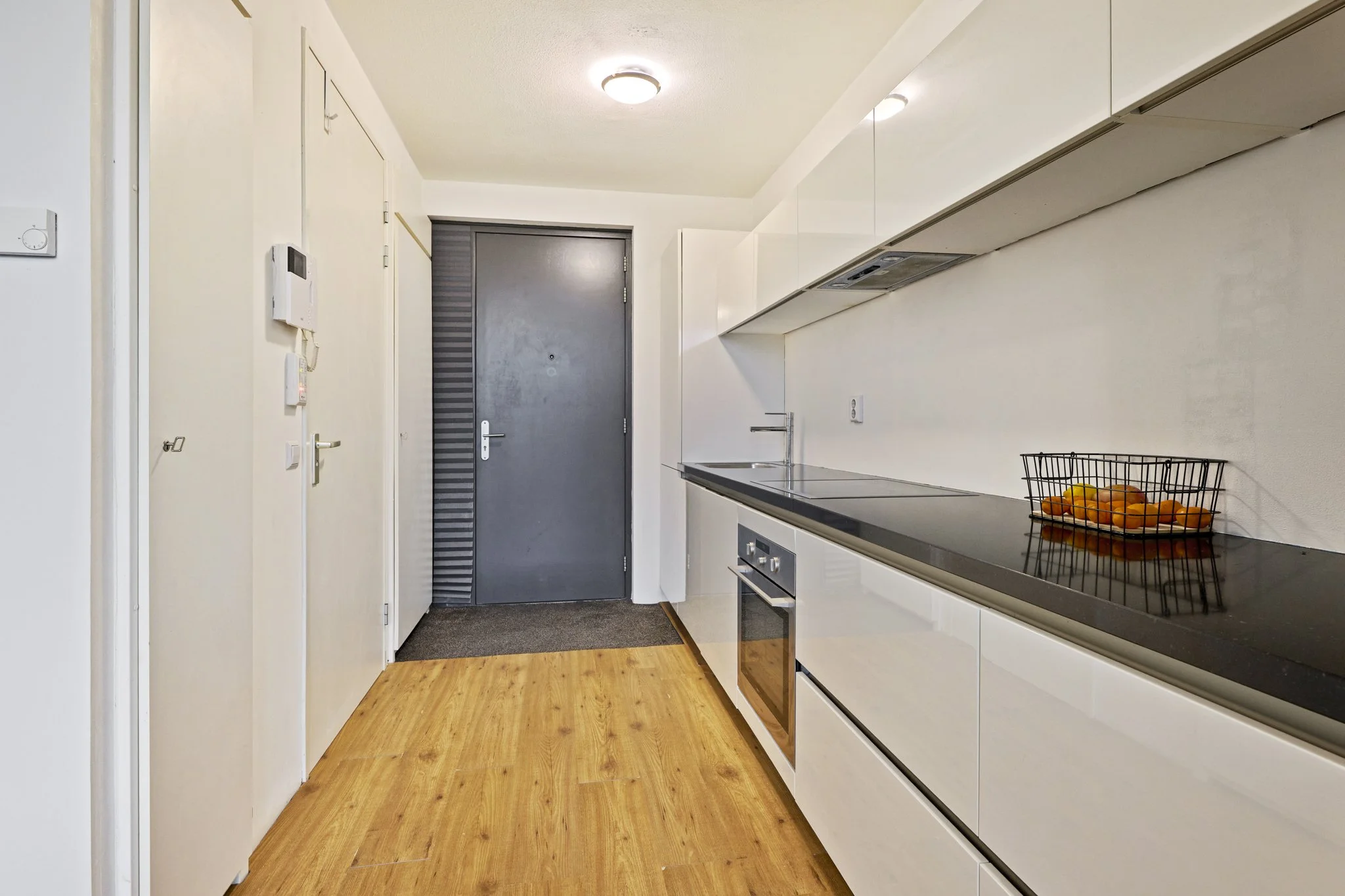 Upon entering, you’ll immediately notice the open living space where the living, sleeping, and cooking areas seamlessly flow together. The modern kitchen is equipped with practical appliances and offers ample workspace for everyday use. At the front, there’s a bright living area. Thanks to the high ceilings and smart layout, the studio feels spacious and airy. Cleverly designed built-in storage provides extra convenience, keeping everything neat and organized. With underfloor heating and cooling (district heating), you’ll enjoy year-round comfort. The property also features a heat recovery ventilation system (WTW), HR++ double glazing, a video intercom system, and fiber-optic internet.