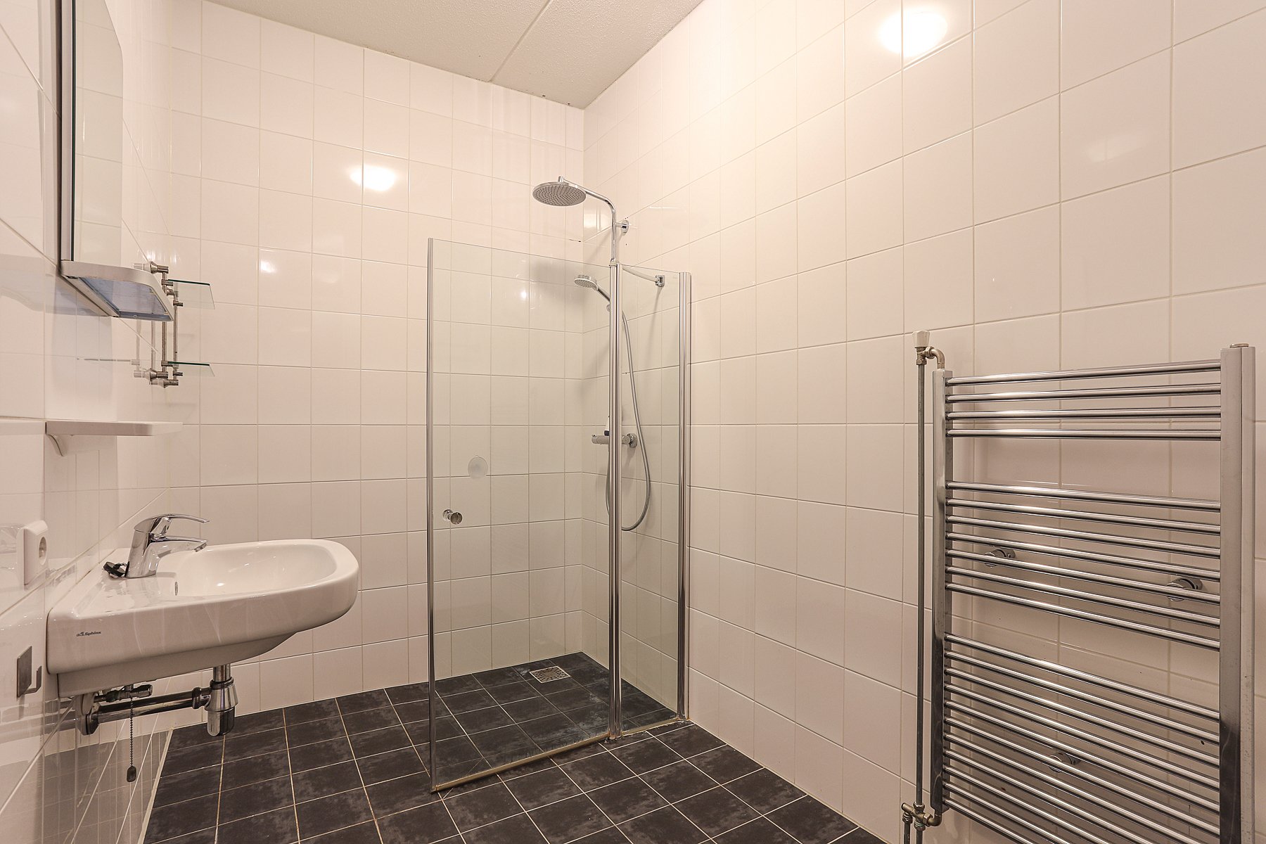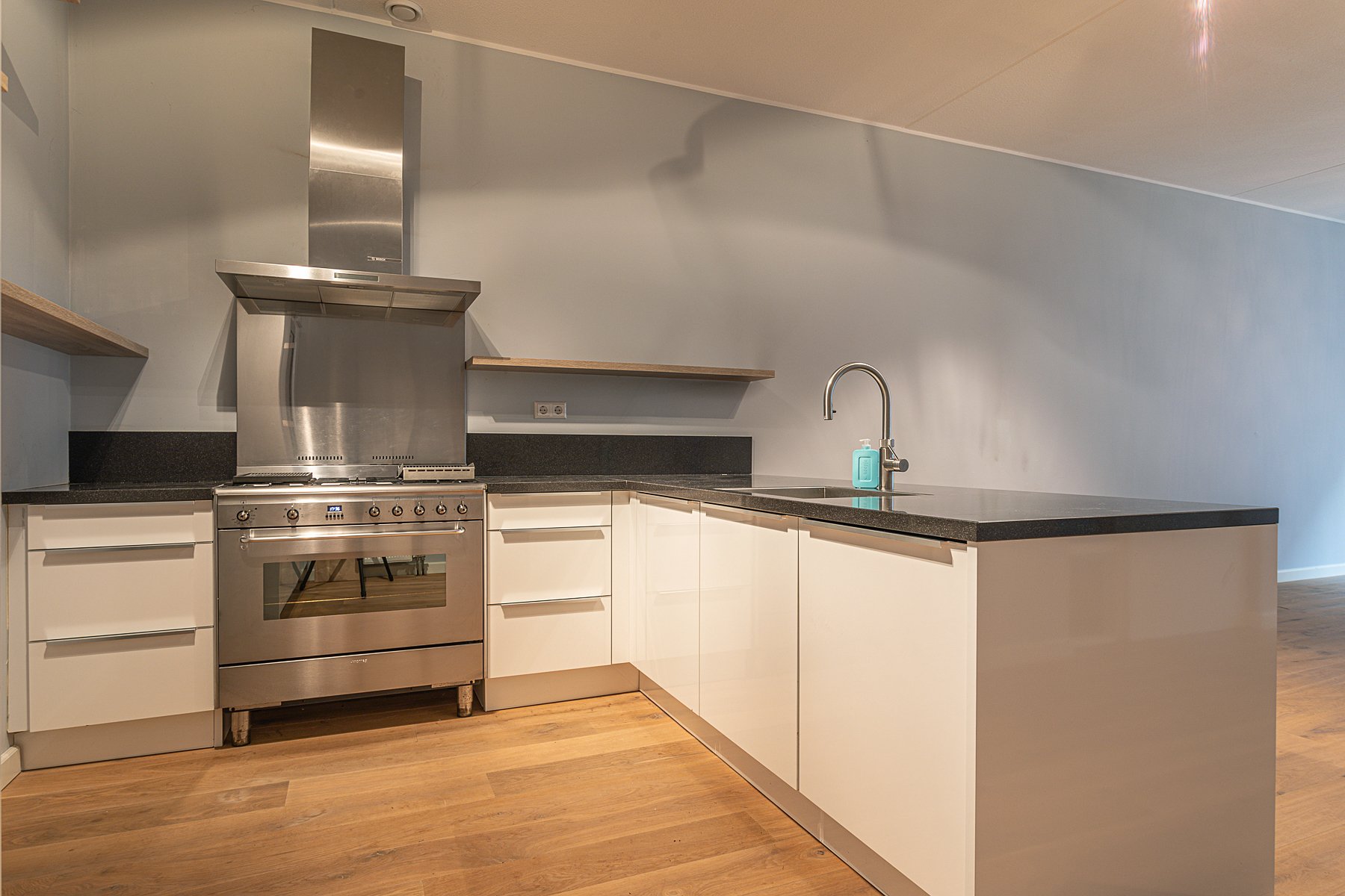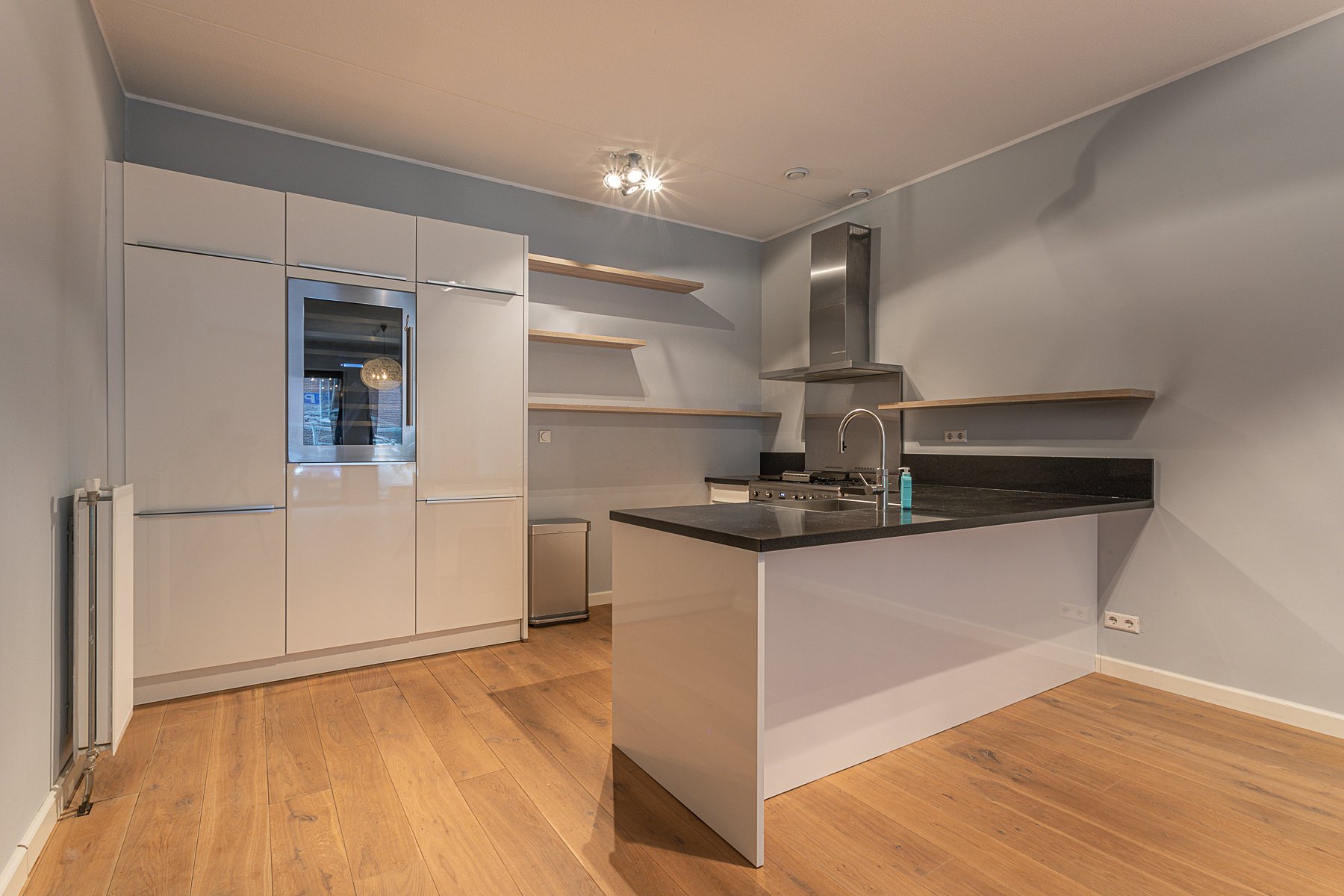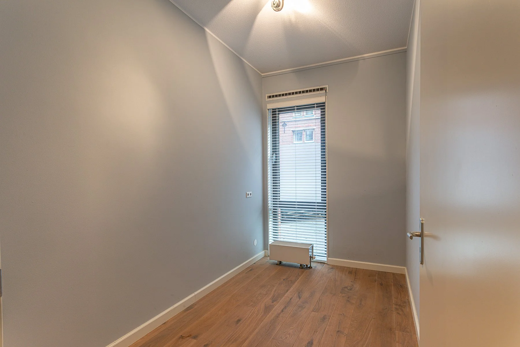 At the front of the complex is the central hall where the call boards and mailboxes are located. You enter the hall of the house through the front door on the ground floor. Here the beautiful wooden floor immediately catches the eye, this floor is laid throughout the house and gives the house a feeling of luxury. All areas are easily accessible through this hall. As soon as you enter the living room, the modern open kitchen and the large windows with French doors immediately stand out. This makes the living room nice and light and the large kitchen is equipped with a fridge / freezer, a 5-burner gas stove and a nice wine cooler. The two spacious bedrooms are both light and equipped with a large wardrobe / storage closet. The neat bathroom is equipped with a walk-in shower and washbasin. The toilet with wash basin is located separately.