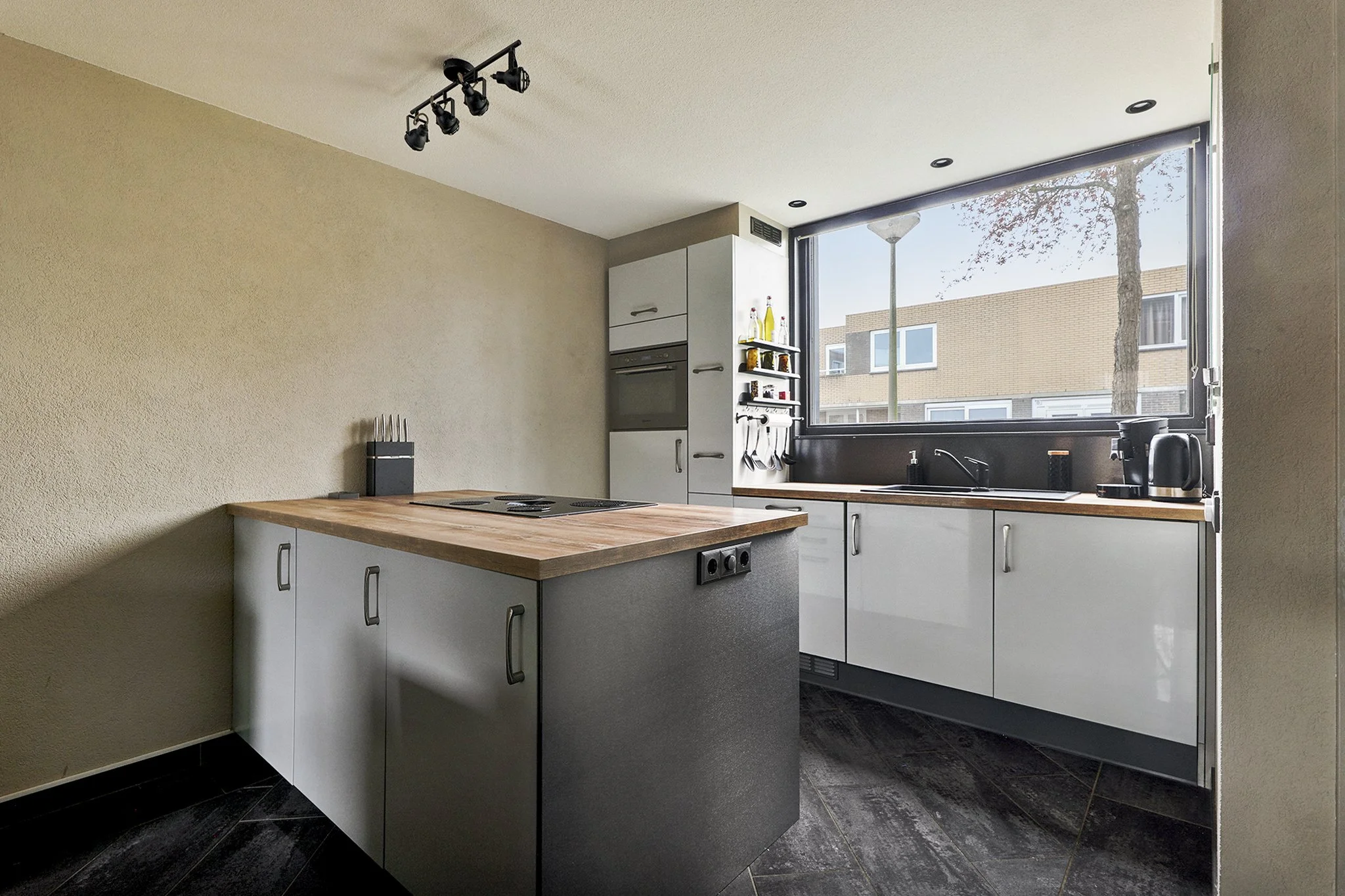 Aan de voorzijde van de woning bevindt zich de moderne open keuken, uitgevoerd met een kookeiland. De keuken is voorzien van diverse inbouwapparatuur en biedt veel werk- en bergruimte. Vanuit het kookeiland is er zicht op de woonkamer, wat zorgt voor een open en functionele indeling. Aansluitend bevindt zich de eethoek, met voldoende ruimte voor een grote eettafel.