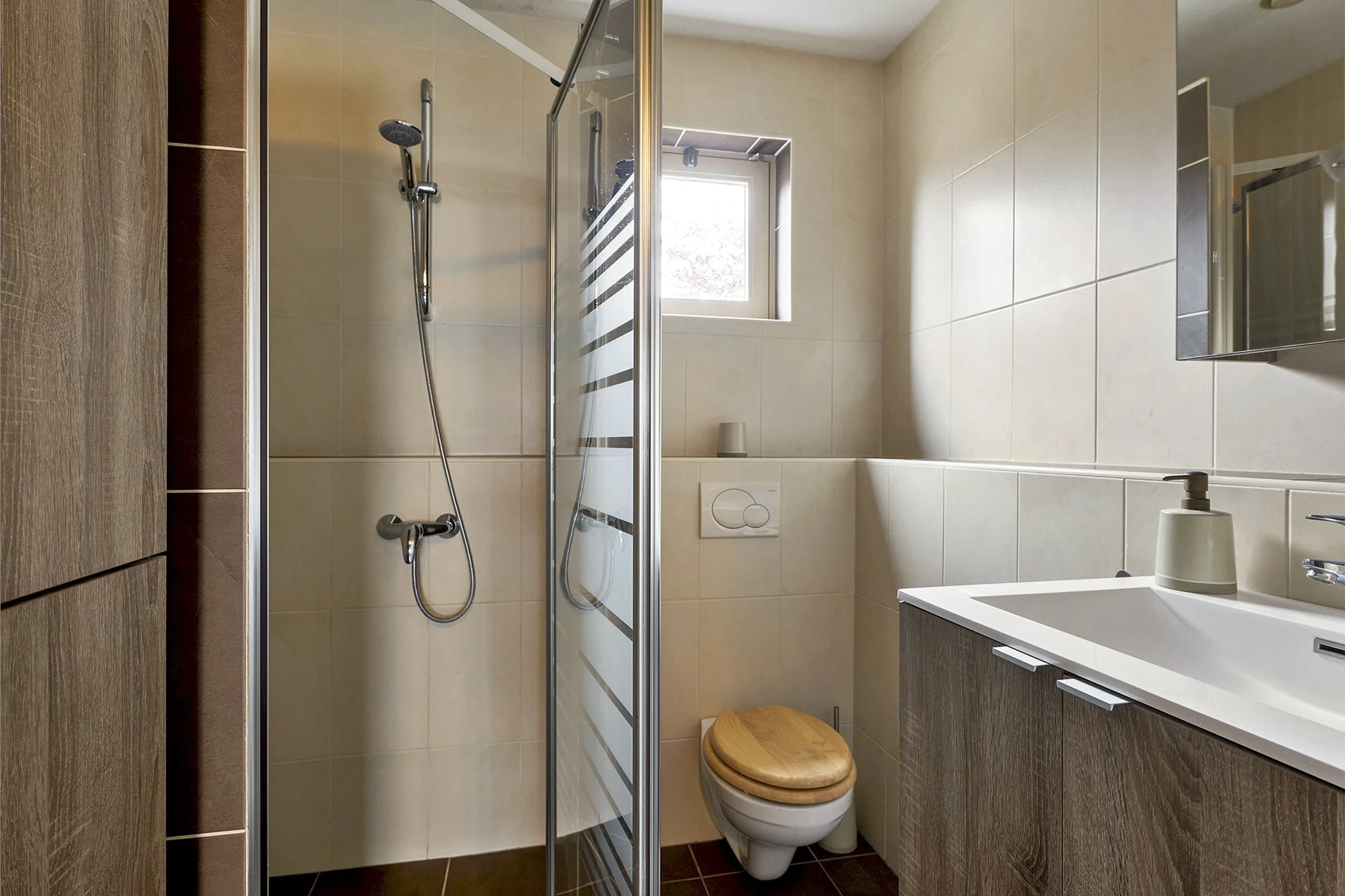 De eerste badkamer beschikt over een inloopdouche, toilet en wastafel. Een fijne, functionele ruimte die van alle gemakken is voorzien.