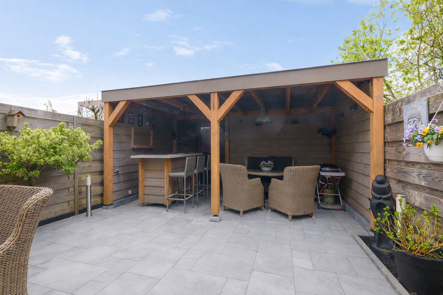 De diepe achtertuin is een heerlijke plek om te ontspannen en biedt volop mogelijkheden. Onder de houten overkapping vindt u een sfeervol barretje en ruimte voor een comfortabele zithoek, perfect voor lange zomeravonden en gezellige borrels.