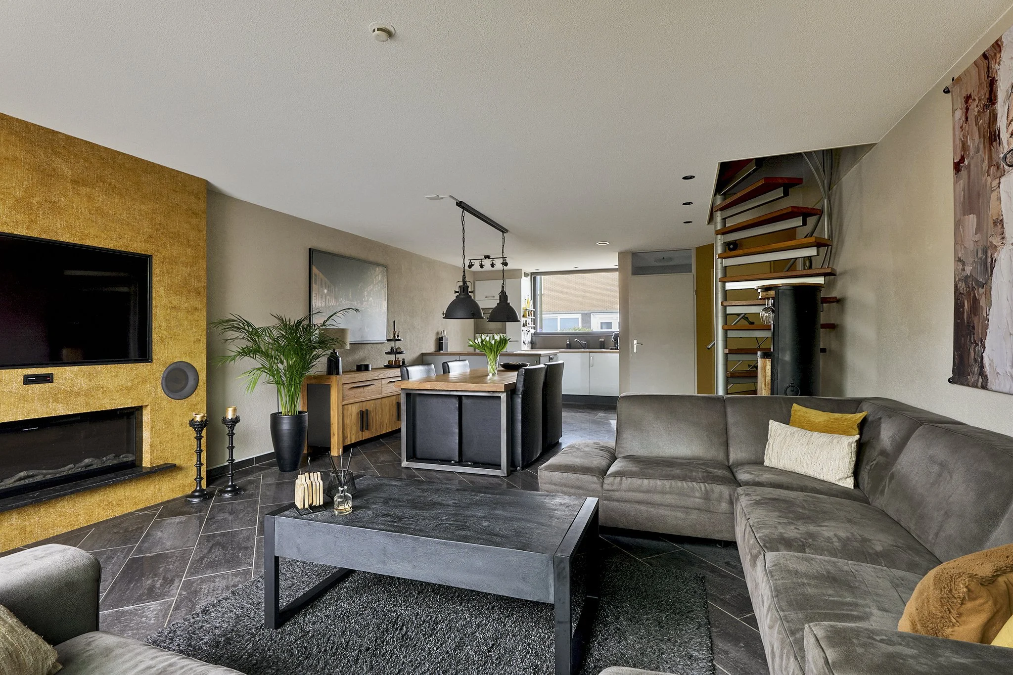 De woonkamer staat in directe verbinding met de tuin door middel van grote glazen schuifdeuren, waardoor binnen en buiten naadloos in elkaar overlopen. Dit zorgt niet alleen voor veel daglicht, maar ook voor een heerlijk ruimtelijk gevoel.