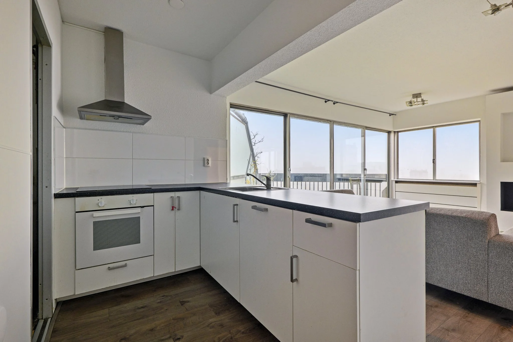 Via de entree bereikt u de ruime hal, die toegang geeft tot alle vertrekken van de woning. Aan de voorzijde bevindt zich de lichte woonkamer met eetgedeelte, gekenmerkt door de brede raampartijen en directe toegang tot het zonnige balkon. De aangrenzende open keuken is praktisch ingedeeld en voorzien van de benodigde aansluitingen.