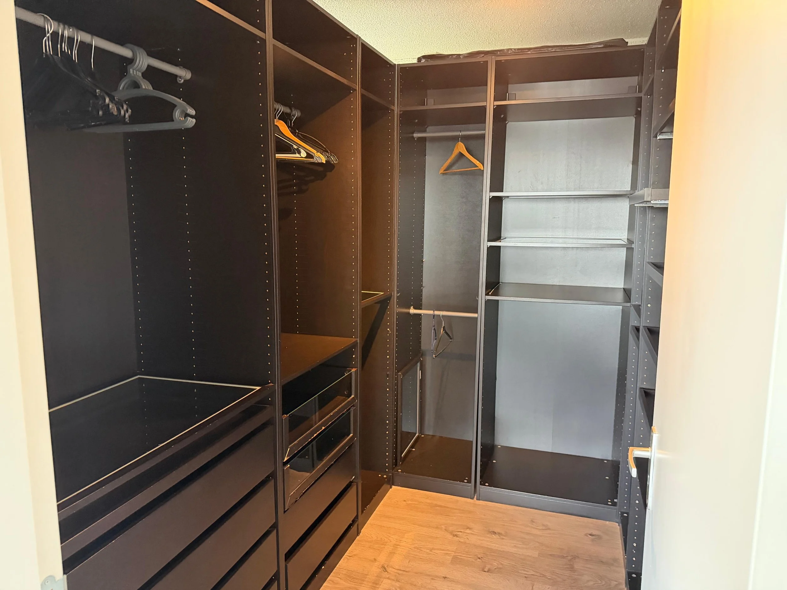 From the living room you enter the bedroom, which offers enough space for a double bed. Directly next to the bedroom is a generous walk-in closet, ideal for extra storage or to convert into a compact workspace.