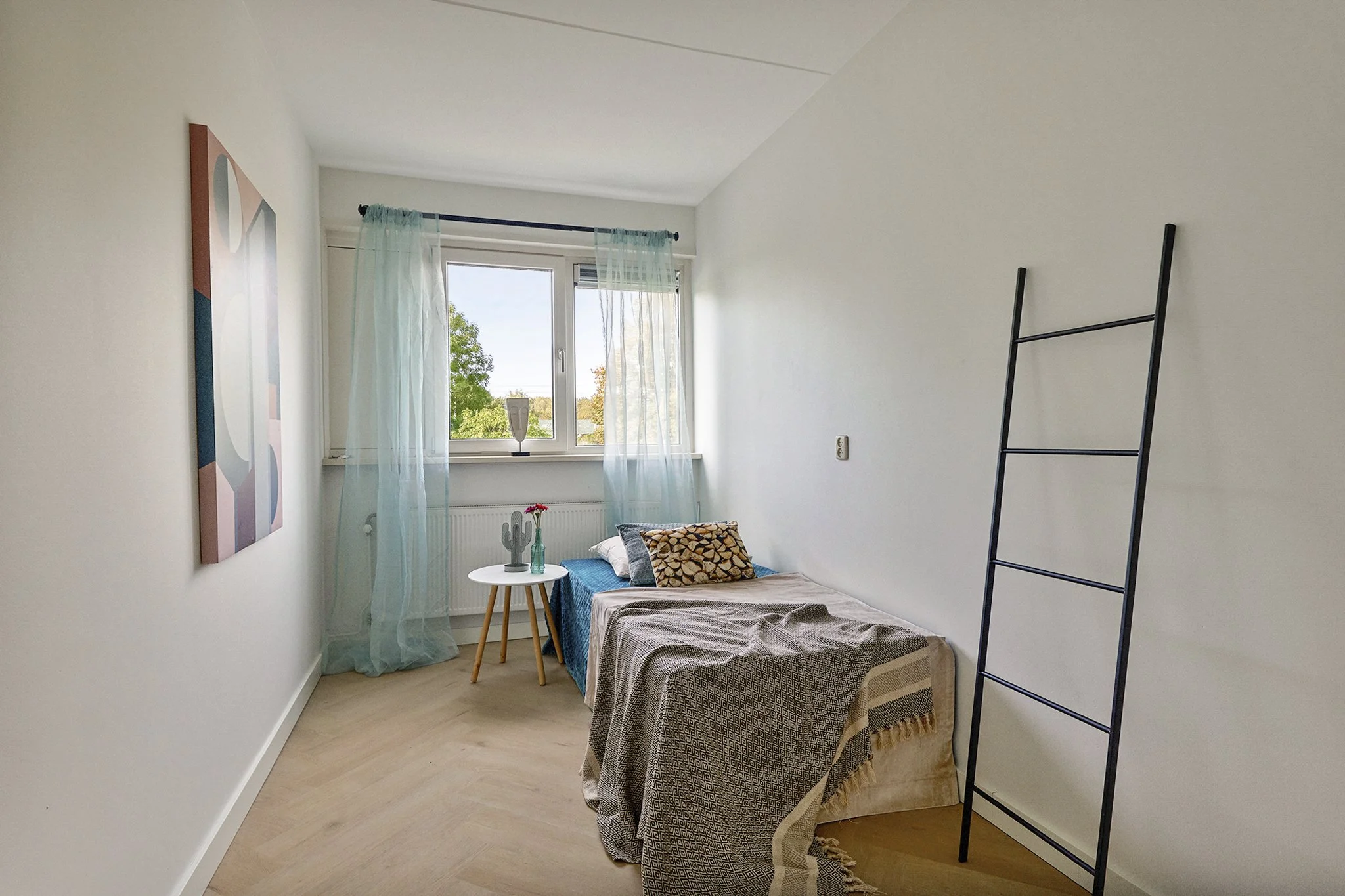 The apartment offers three bedrooms. The largest bedroom is located at the rear of the property and provides ample space for a double bed and wardrobes. The other two bedrooms are at the front and are also full-sized, making them suitable as extra bedrooms, a home office, or hobby room. The bathroom, accessible from the hallway, is equipped with a walk-in shower and a washbasin unit. There is a separate toilet. In addition, an internal storage room is available, convenient for keeping extra belongings.