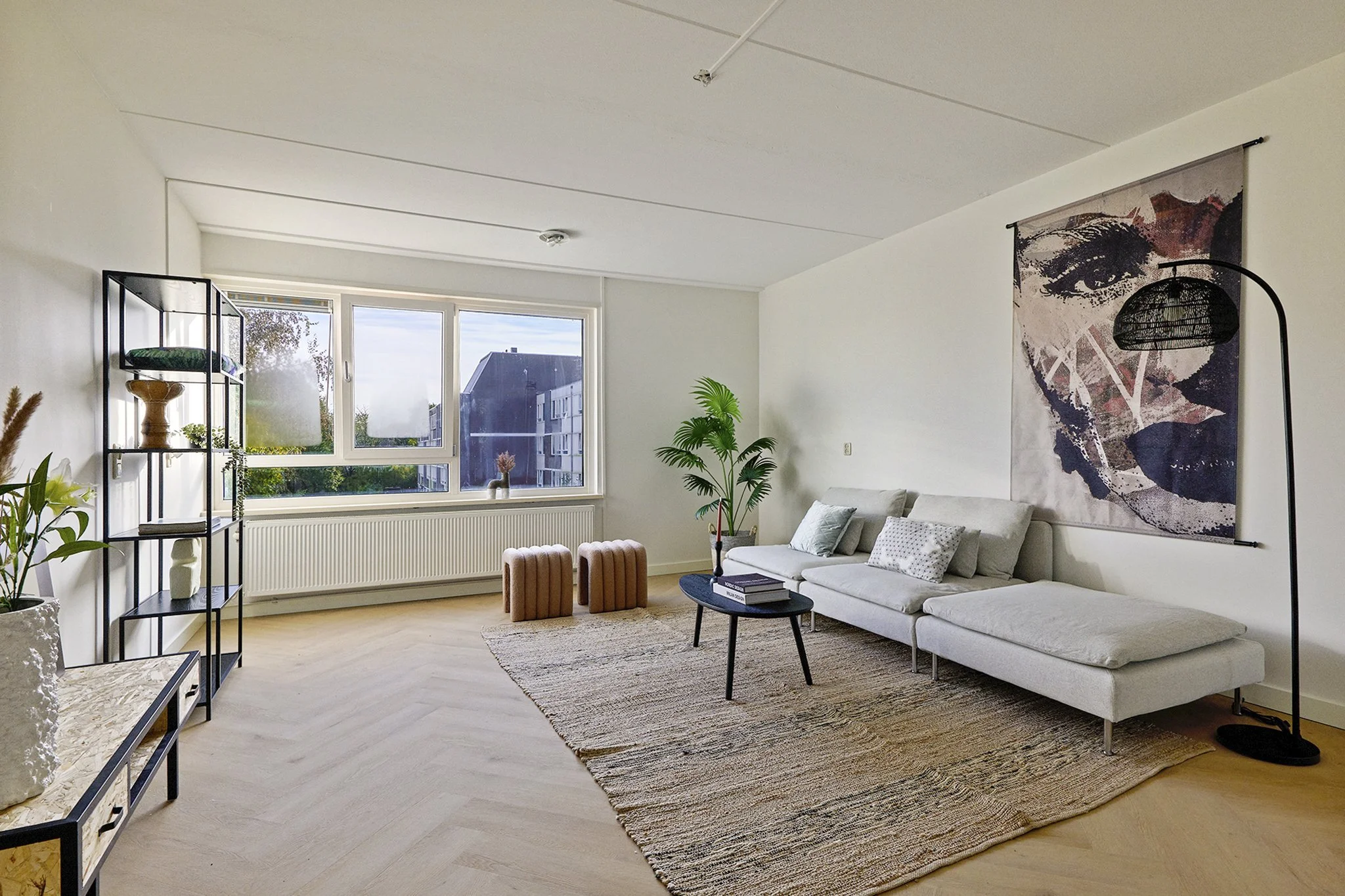 Upon entering, you step into a spacious hallway, centrally located within the apartment, which provides access to almost all rooms. From here, you can reach the living room, kitchen, bedrooms, bathroom, toilet, and storage space. The living room is situated on the right side and offers a bright, wide space with large windows. Thanks to the natural light, the room feels airy and can easily be arranged with a sitting area and, if desired, a dining table.