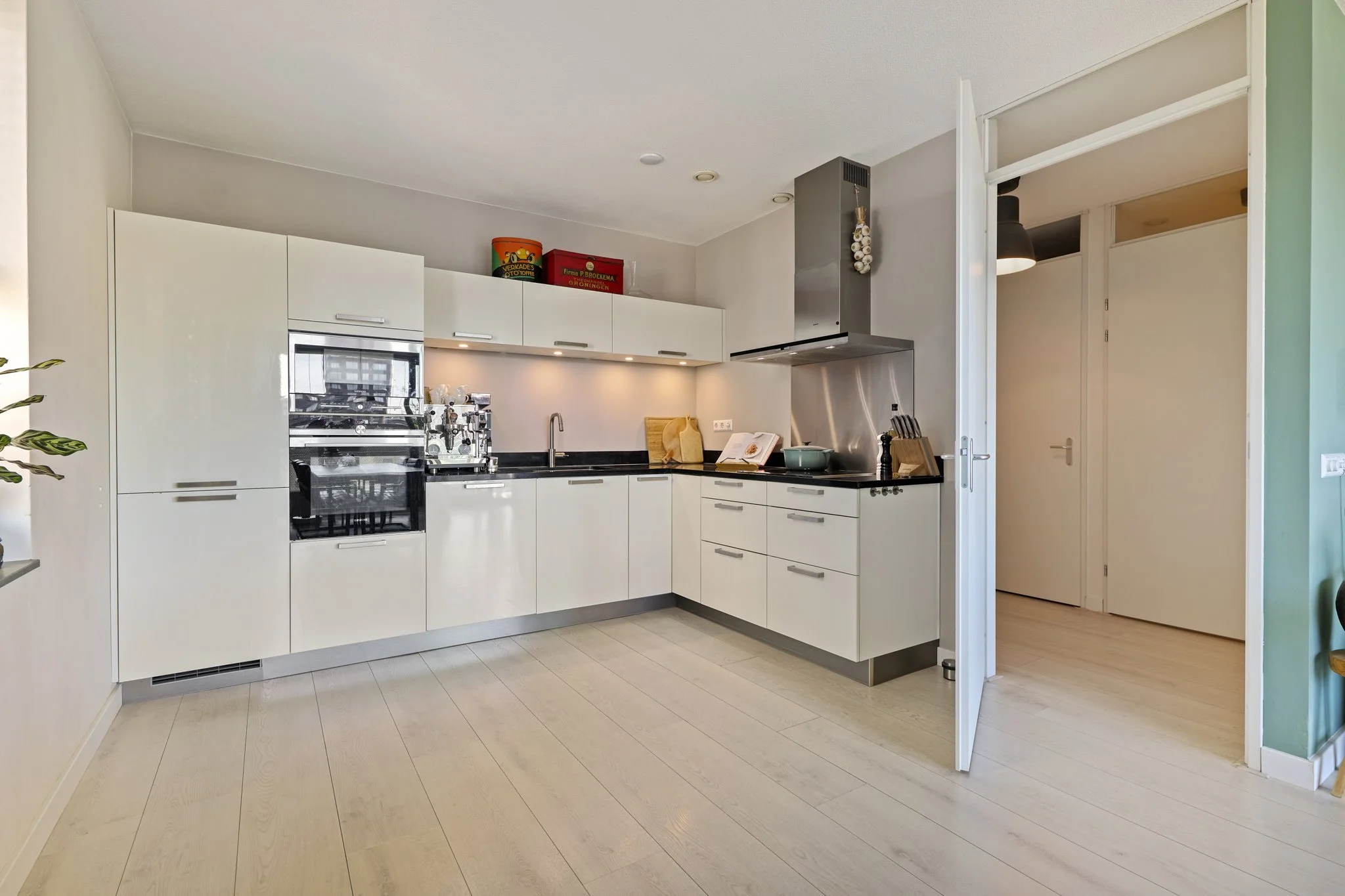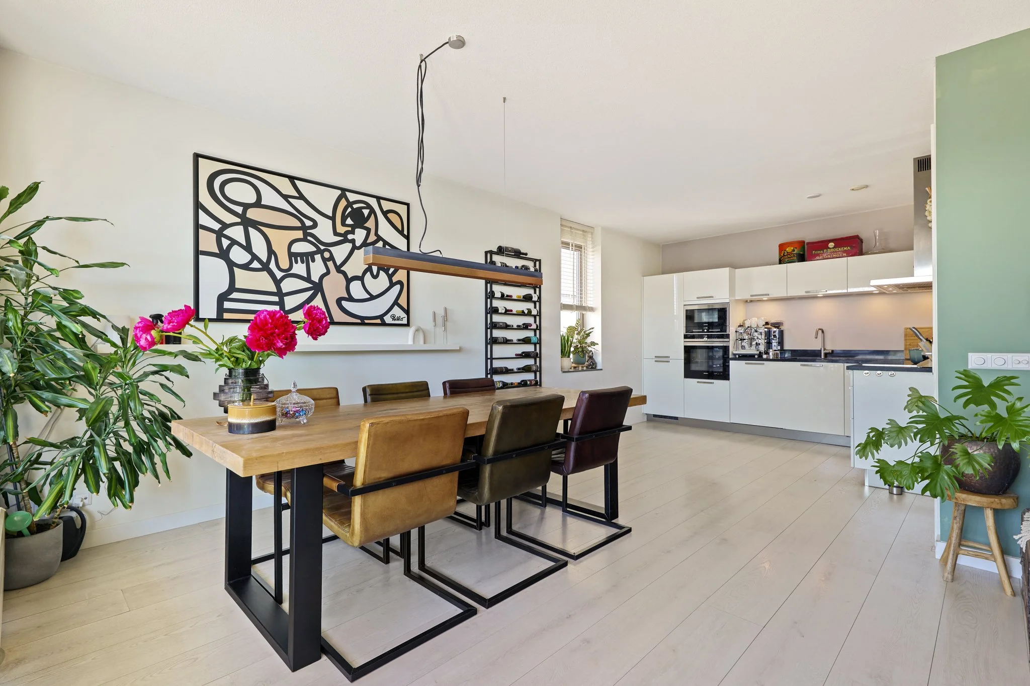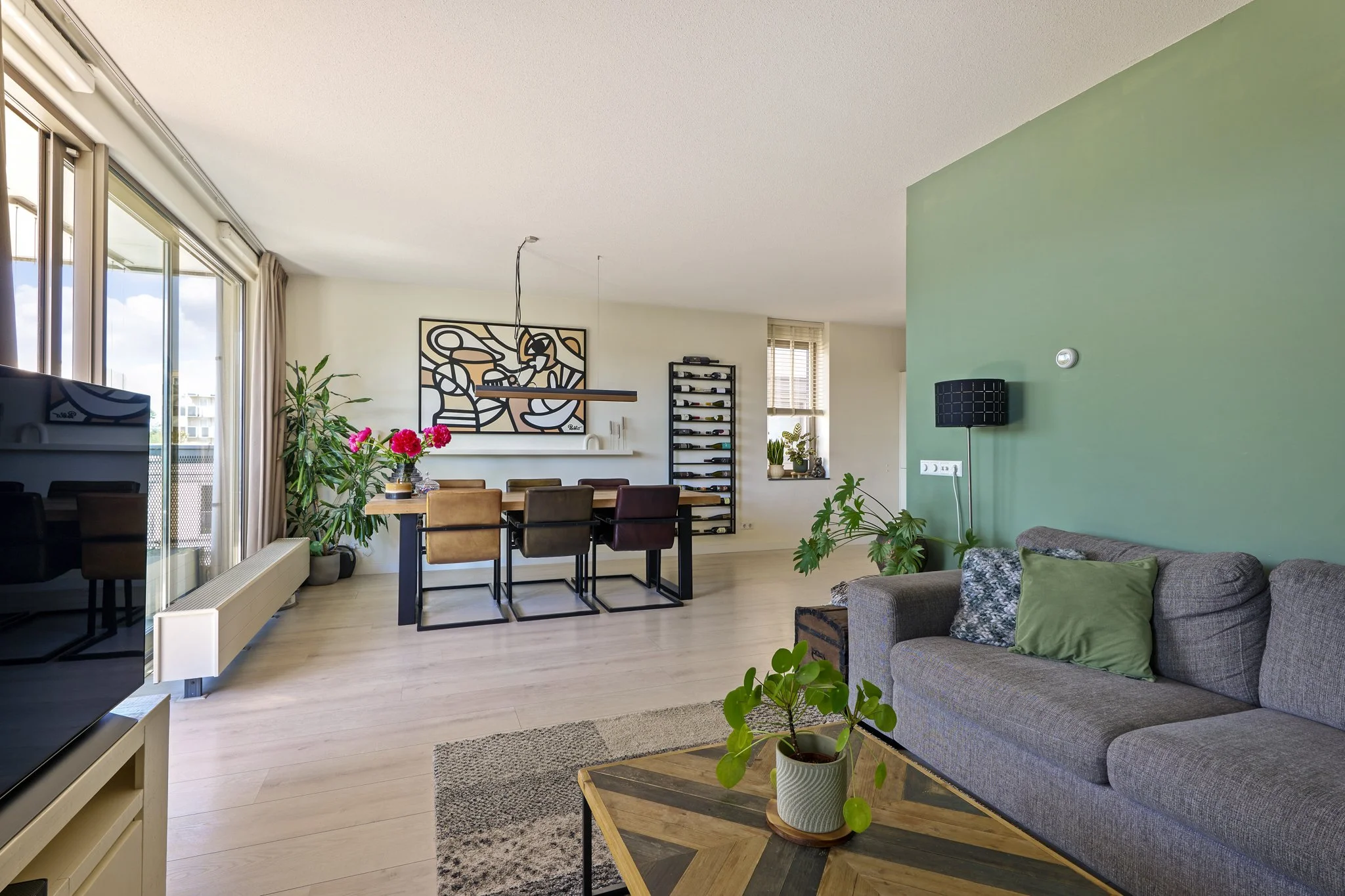 De royale en lichte leefruimte bestaat uit een woonkamer en eetkamer, beide voorzien van grote raampartijen die zorgen voor veel daglicht en direct toegang geven tot het zonnige balkon. Dankzij de open indeling voelt de ruimte extra ruim aan en is er volop vrijheid in de inrichting. Het op het zuiden gelegen balkon van ruim 10 m² is een heerlijk verlengstuk van de woonruimte, met uitzicht op een rustige binnentuin – een groene oase waar je vrijwel de hele dag van de zon kunt genieten.