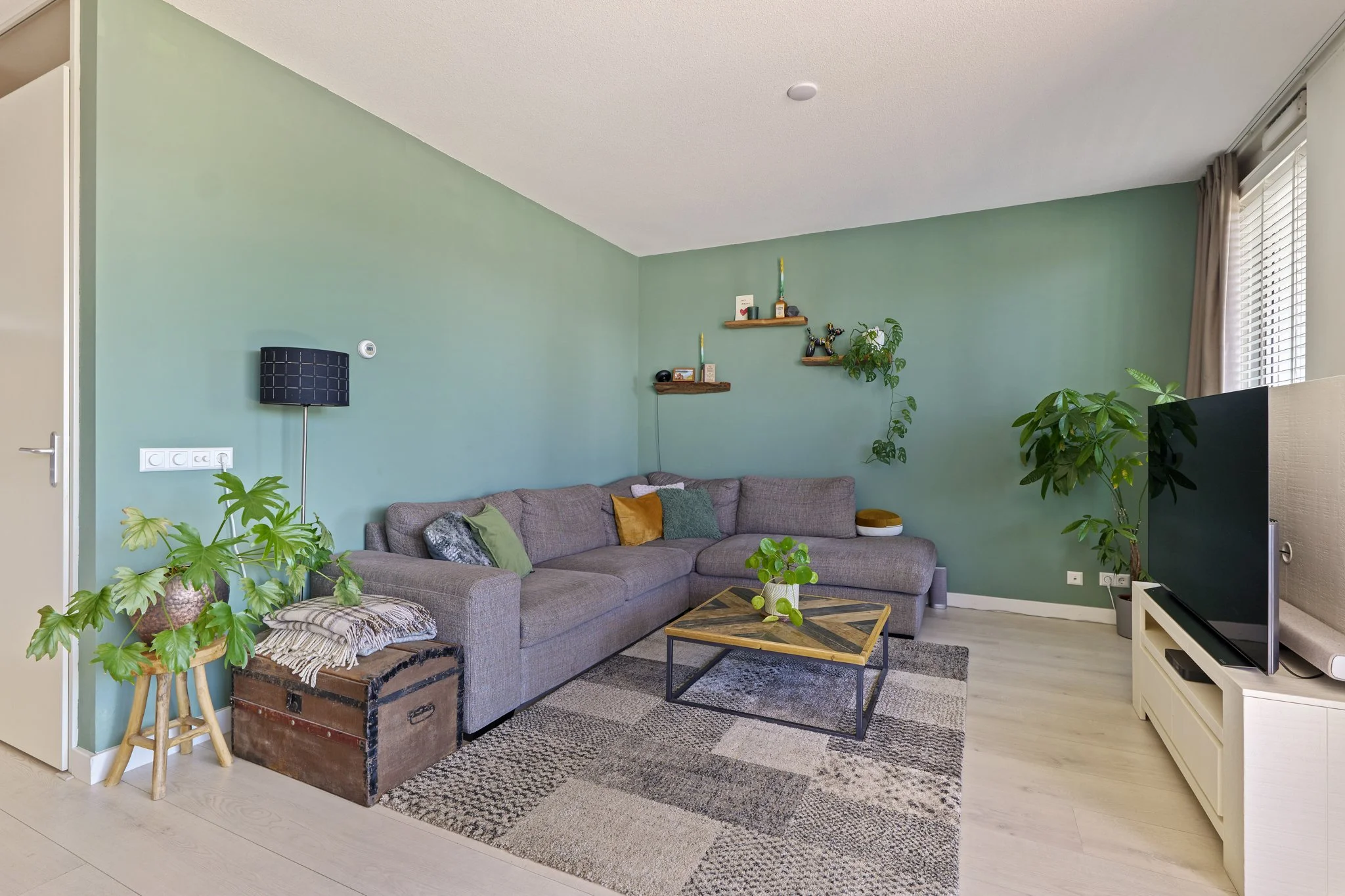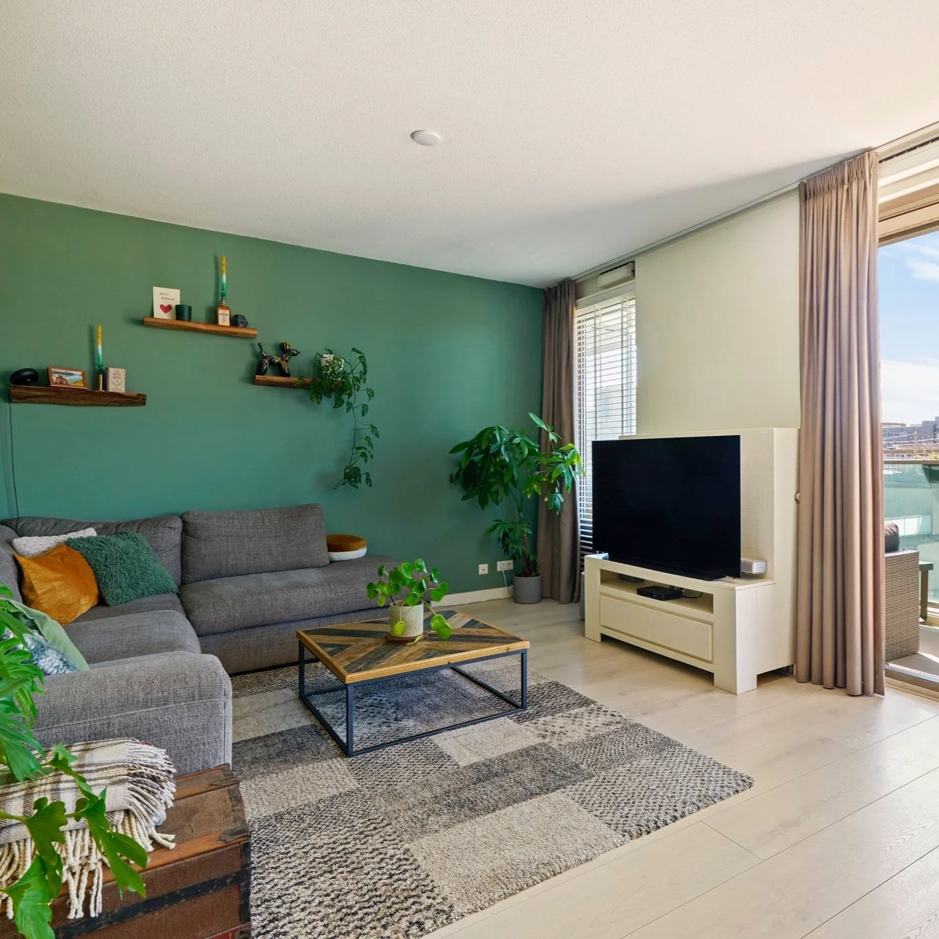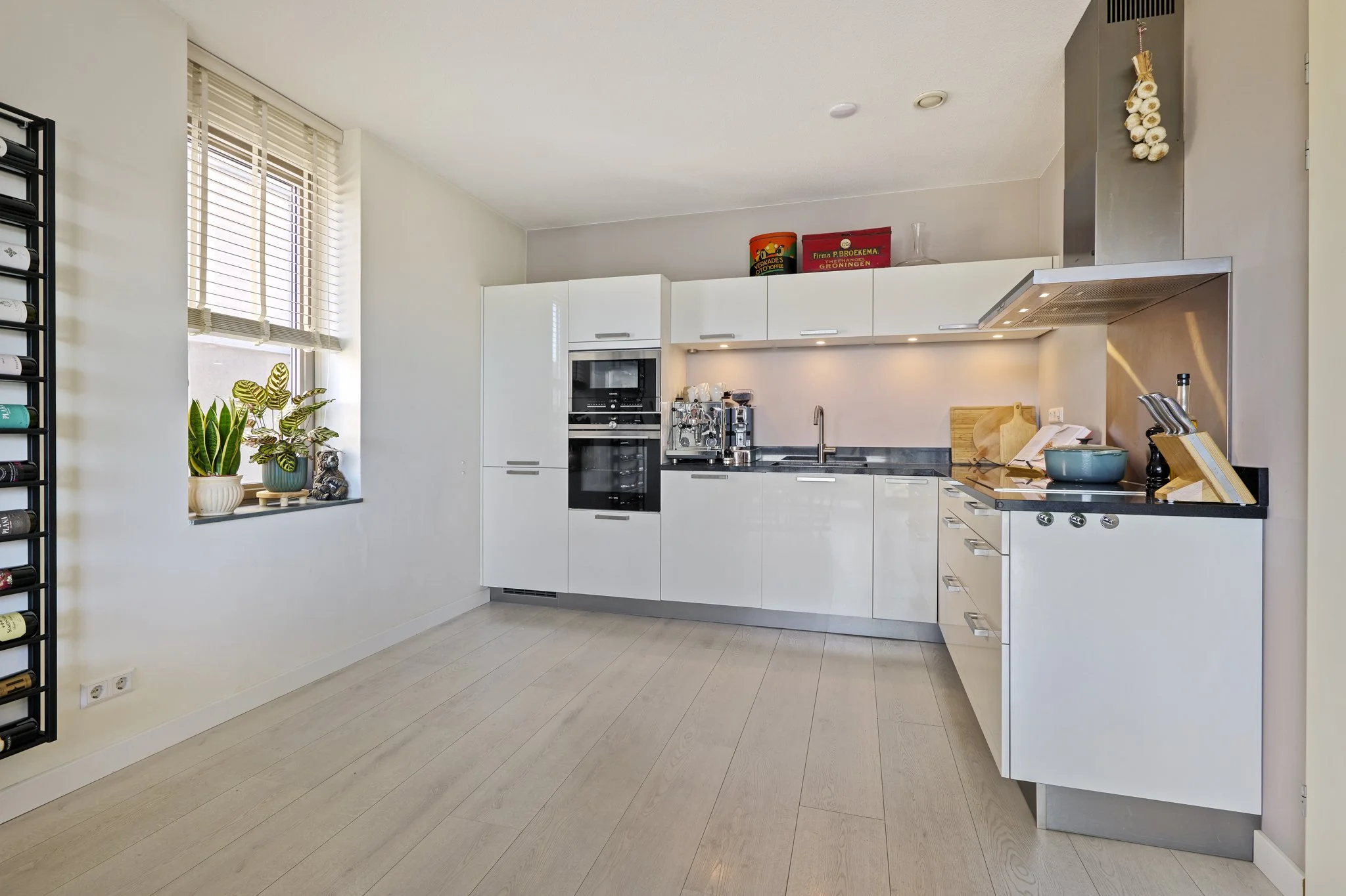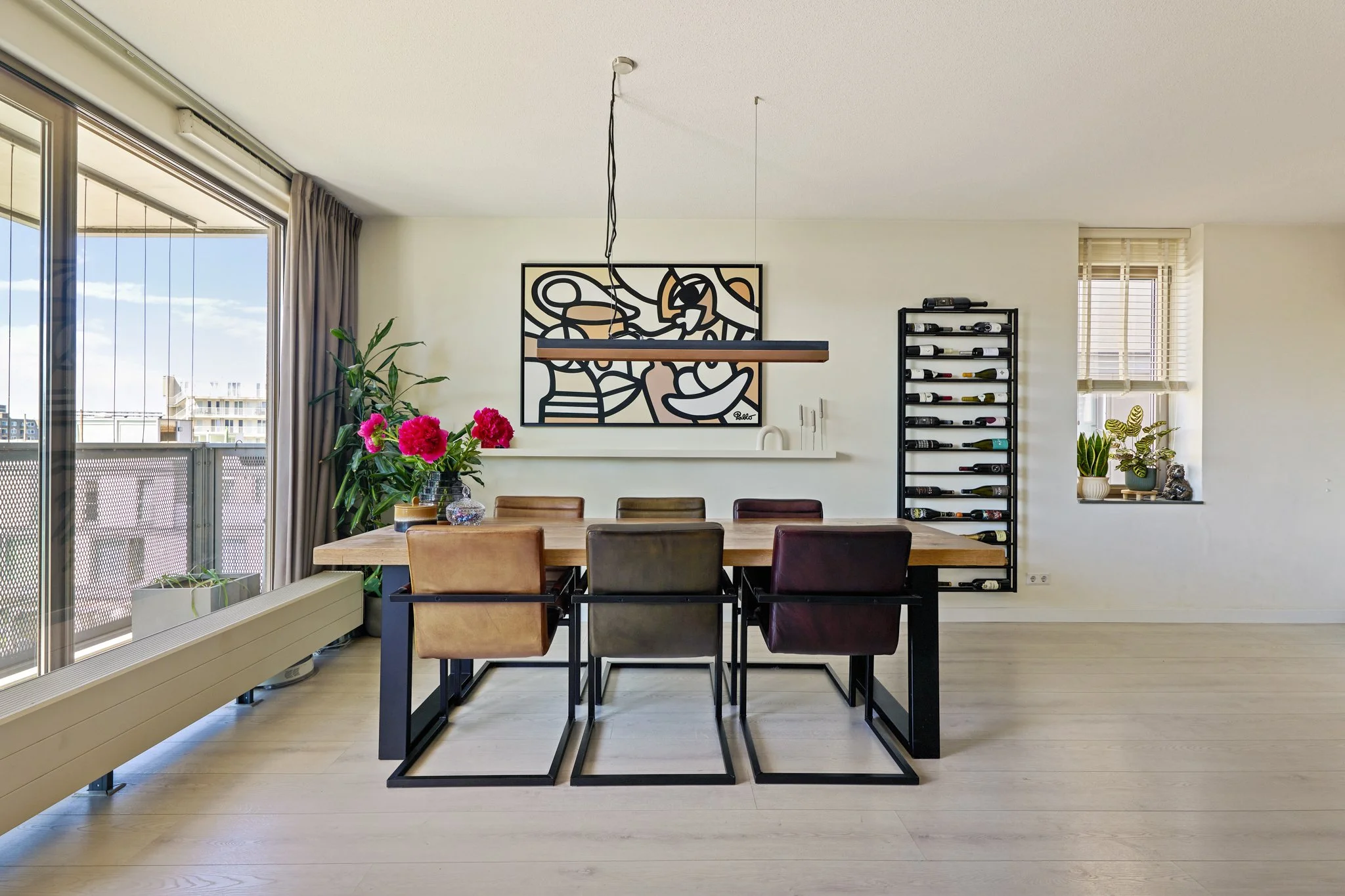 De royale en lichte leefruimte bestaat uit een woonkamer en eetkamer, beide voorzien van grote raampartijen die zorgen voor veel daglicht en direct toegang geven tot het zonnige balkon. Dankzij de open indeling voelt de ruimte extra ruim aan en is er volop vrijheid in de inrichting. Het op het zuiden gelegen balkon van ruim 10 m² is een heerlijk verlengstuk van de woonruimte, met uitzicht op een rustige binnentuin – een groene oase waar je vrijwel de hele dag van de zon kunt genieten.