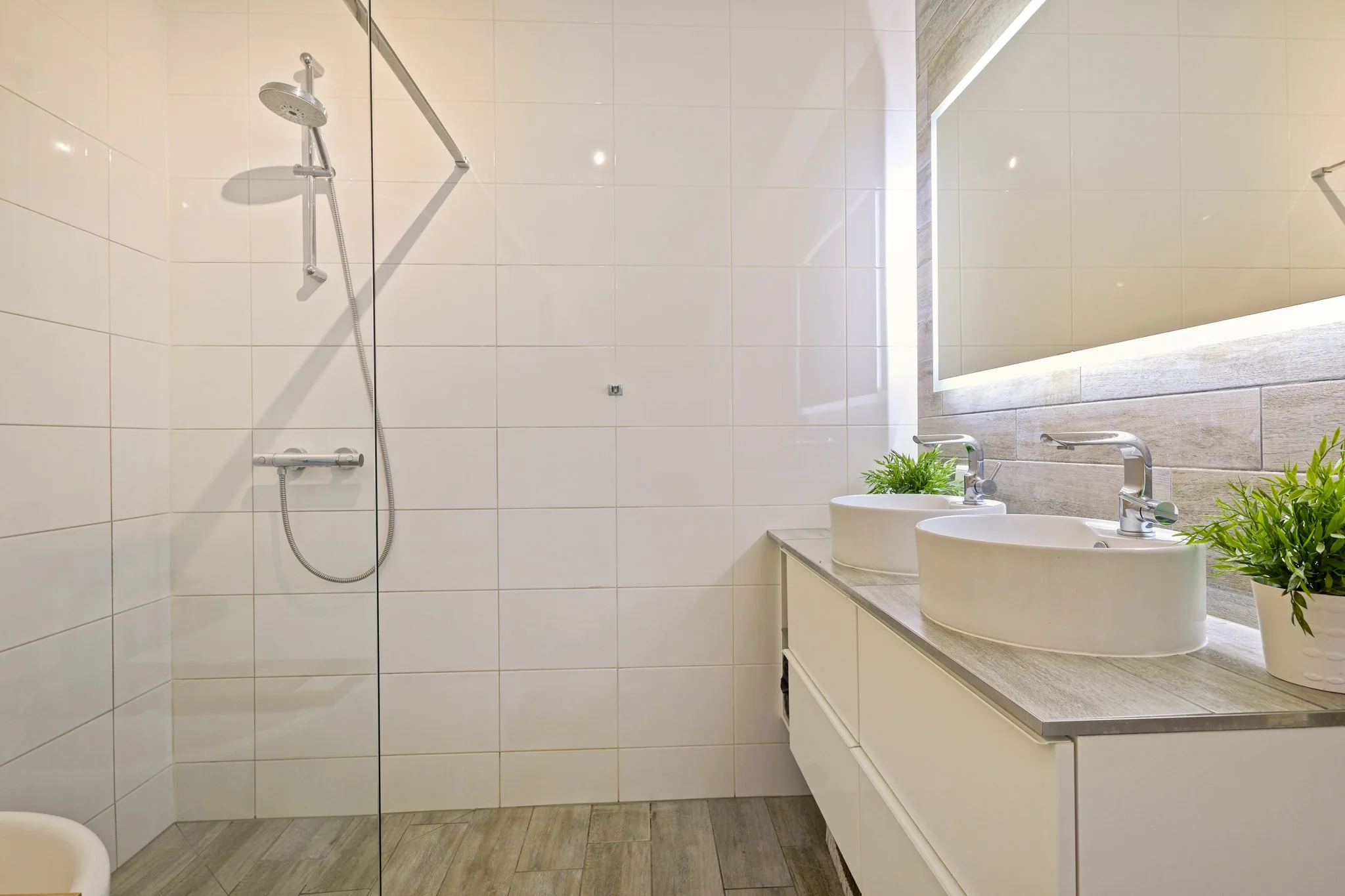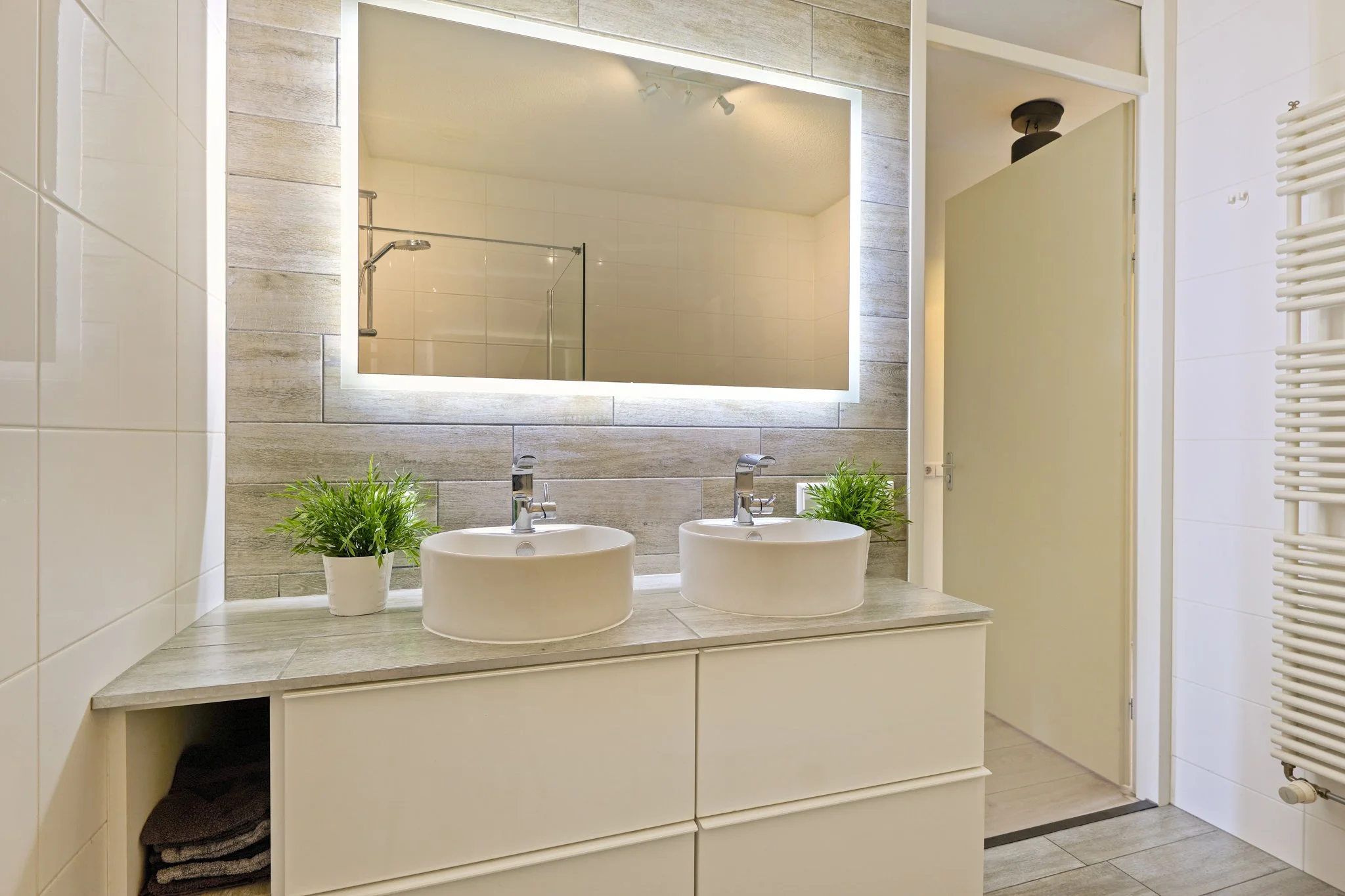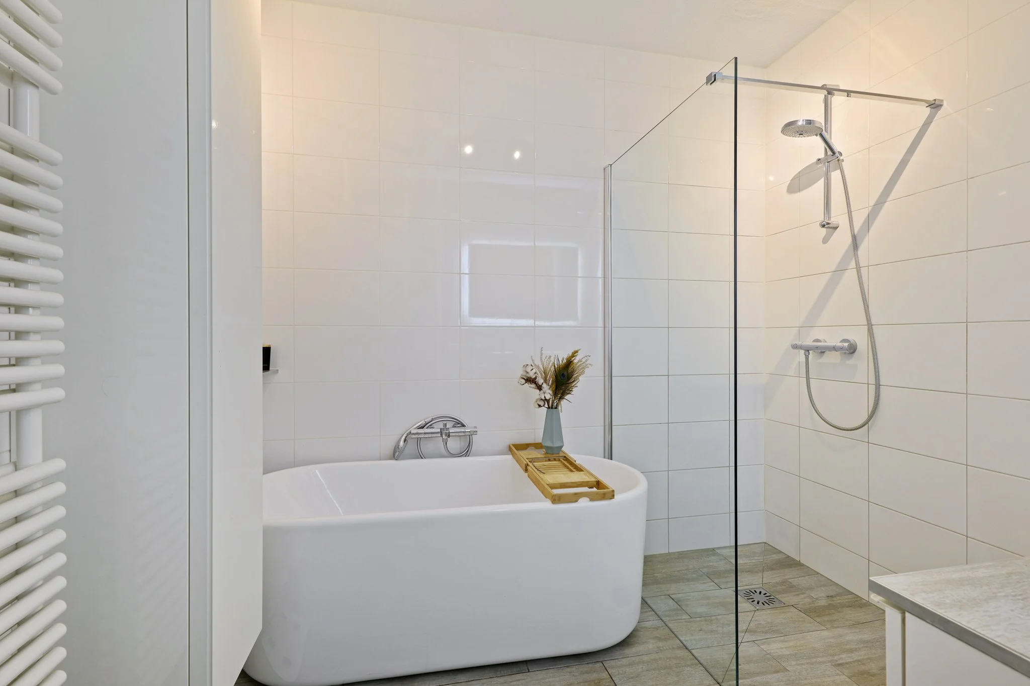 De stijlvolle badkamer is voorzien van een vrijstaand ligbad, een inloopdouche en een dubbel wastafelmeubel met verlichte spiegel. Het separate toilet met fontein is uitgevoerd in dezelfde moderne stijl.