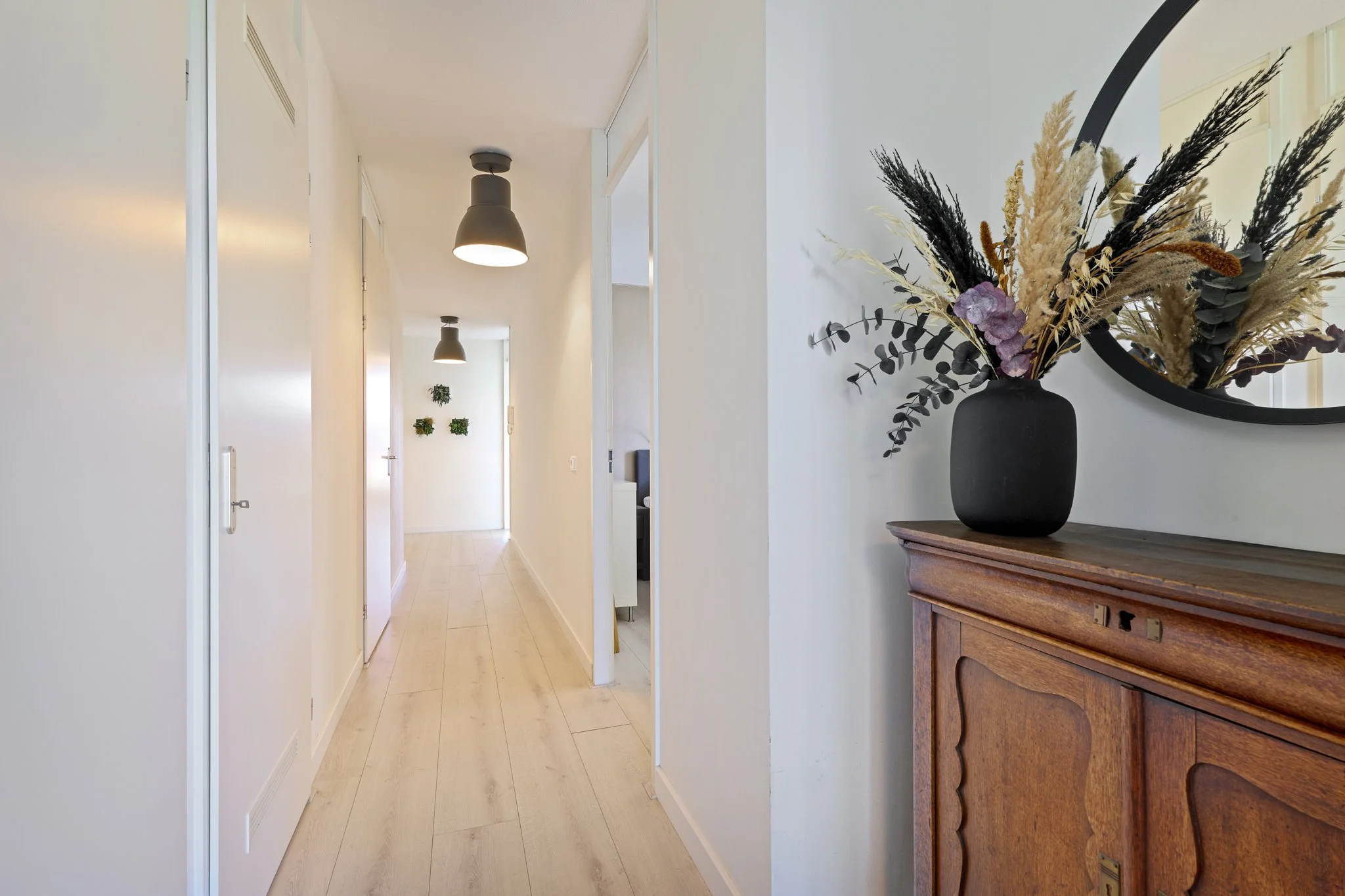 Bij binnenkomst betreed je een ruime en uitnodigende hal, voorzien van een garderobe, meterkast en een praktische inpandige berging met aansluitingen voor een wasmachine en droger. De laminaatvloer loopt naadloos door in de rest van de woning en draagt direct bij aan de huiselijke sfeer.